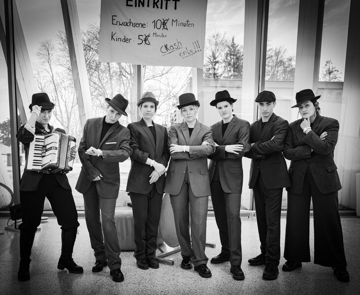 Das Ensemble des Instituts JIM (Jazz und improvisierte Musik) präsentierte sich in einer interessanten Besetzung aus E-Bass, Geige, Klavier, Oud, Saxophon, Schlagzeug und Stimme. Beim Vortrag des Liedes „Heast’s net“ von Hubert von Goisern schaffte das Gesangsensemble EMP (Elementare Musikpädagogik) eine konzentrierte Stille im Saal. Insgesamt waren Studierende aus fünf Instituten beteiligt. Am Ende riefen alle Künstler*innen bei großem Beifall auf die Frage „Ist heute wirklich Schluss?“: „Heute ist nicht alle Tage – wir kommen wieder, keine Frage!“